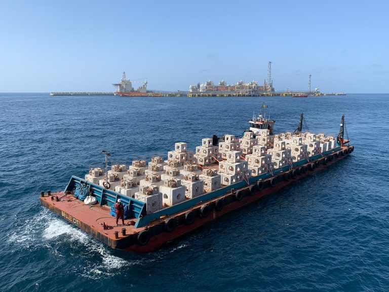 Reef cubes are modular habitat enhancement units that are low-carbon, plastic-free and made from 98% recycled materials. They’re built with a nature-inclusive design and contain a spherical chamber with passages on each of the cube faces. The cubes used in REFAS 2 offered a 91% reduction in CO2 emissions, but we have since finalised our mix to reach carbon-neutral status.